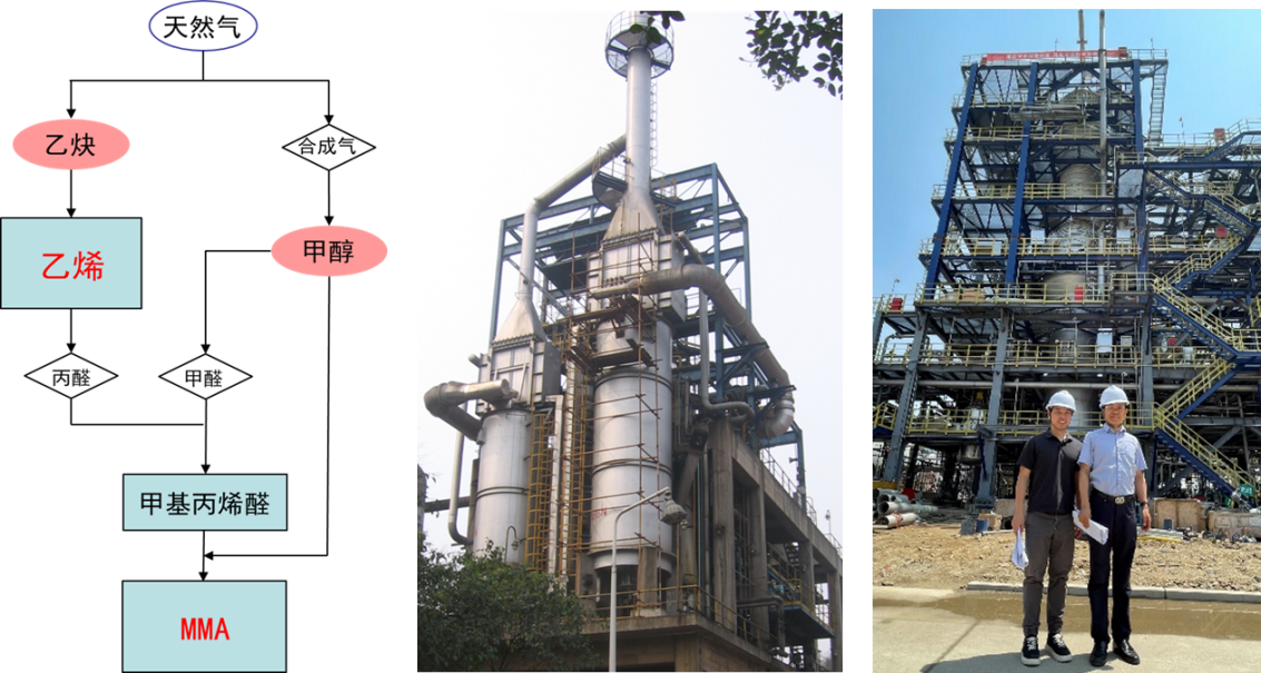 产业链技术(左)、天然气部分氧化制乙炔(中)和氧化酯化连续化反应器(右)